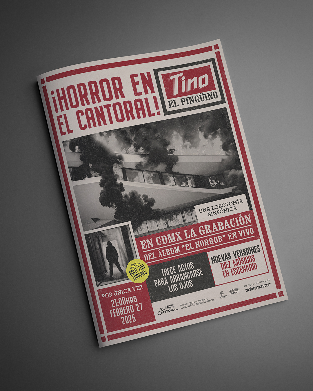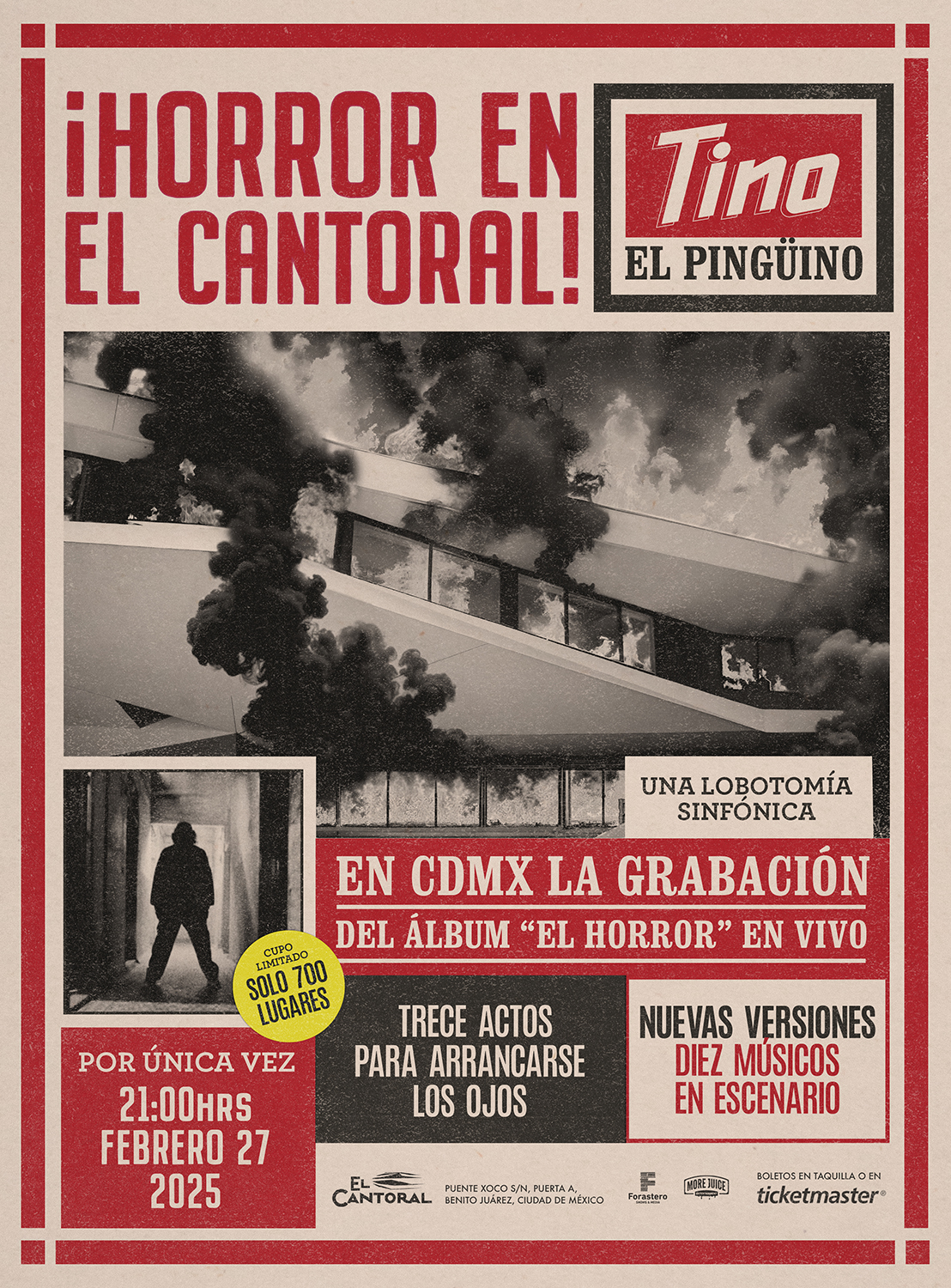 Cartel promocional para el show “¡Horror en el cantoral!, el concierto ofrecido por el artista del hip-hop, Tino el Pingüino, en la sala de conciertos de la Ciudad de México, El Cantoral, en el cual reinterpretó en una presentación única todos los temas de su disco El Horror, junto a una de serie de músicos en escena.